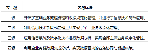 2022年10月,工業(yè)和信息化部發(fā)布了《中小企業(yè)數(shù)字化水平評(píng)測(cè)指標(biāo)》,從數(shù)字化基礎(chǔ)、經(jīng)營(yíng)、管理和成效四個(gè)維度評(píng)估中小企業(yè)數(shù)字化水平,將數(shù)字化水平劃分為四個(gè)等級(jí)[1](表1)。