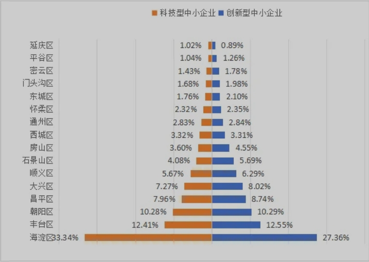 圖1 北京市科技型中小企業(yè)和創(chuàng)新型中小企業(yè)區(qū)域分布 2.兩類(lèi)企業(yè)培育導(dǎo)向基本一致,創(chuàng)新型中小企業(yè)指標(biāo)體系覆蓋面更廣。 科技型中小企業(yè)和創(chuàng)新型中小企業(yè)的評(píng)價(jià)指標(biāo)均關(guān)注企業(yè)研發(fā)創(chuàng)新活動(dòng)、研發(fā)成果產(chǎn)出情況,在研發(fā)投入、知識(shí)產(chǎn)權(quán)產(chǎn)出上分別設(shè)置計(jì)分指標(biāo)。科技創(chuàng)新型中小企業(yè)在研發(fā)活動(dòng)上設(shè)置科技人員指標(biāo),考核科技人員占企業(yè)職工總數(shù)的比例,更聚焦于企業(yè)本身在研發(fā)活動(dòng)上的要素投入。創(chuàng)新型中小企業(yè)同時(shí)要考核企業(yè)的成長(zhǎng)性和專(zhuān)業(yè)度,對(duì)企業(yè)主營(yíng)業(yè)務(wù)收入、資產(chǎn)負(fù)債率、主導(dǎo)產(chǎn)品所屬領(lǐng)域和產(chǎn)生收入占比情況設(shè)置計(jì)分指標(biāo)。 這種差異從直通指標(biāo)設(shè)置中也可體現(xiàn),兩類(lèi)企業(yè)如獲得高級(jí)別科技獎(jiǎng)勵(lì)、擁有其他科技創(chuàng)新類(lèi)企業(yè)資質(zhì)、成立省部級(jí)研發(fā)機(jī)構(gòu)均可獲得直通資格。不同的是,對(duì)將先進(jìn)技術(shù)轉(zhuǎn)化為標(biāo)準(zhǔn)、在市場(chǎng)形成一定自我保護(hù)壁壘的中小企業(yè)設(shè)置給予科技型中小企業(yè)稱(chēng)號(hào)“直通車(chē)”資格(主導(dǎo)制定過(guò)國(guó)際標(biāo)準(zhǔn)、國(guó)家標(biāo)準(zhǔn)或行業(yè)標(biāo)準(zhǔn)),對(duì)在資本市場(chǎng)獲得了認(rèn)可的、擁有一定資本實(shí)力的中小企業(yè)可獲得創(chuàng)新型中小企業(yè)稱(chēng)號(hào)“直通車(chē)”資格(近三年內(nèi)新增股權(quán)融資總額(合格機(jī)構(gòu)投資者的實(shí)繳額)500萬(wàn)元以上)。 3.兩類(lèi)企業(yè)創(chuàng)新目的不同,在創(chuàng)新能力和產(chǎn)業(yè)支撐方面各有側(cè)重。 科技型中小企業(yè)更多考慮處于研發(fā)階段且暫未形成一定經(jīng)濟(jì)收入的企業(yè),如在研發(fā)費(fèi)用投入上設(shè)置二選一靈活指標(biāo),企業(yè)可自行選擇研發(fā)費(fèi)用與銷(xiāo)售收入和成本費(fèi)用支出相比較取得優(yōu)勢(shì)指標(biāo)。在科研人員上的關(guān)注同樣體現(xiàn)出科技型中小企業(yè)對(duì)研發(fā)投入上的傾斜,不僅要求企業(yè)投入更多的研發(fā)資金,在科研人員力量配備上也同步提出要求并作為門(mén)檻條件(科技人員指標(biāo)得分不得為0分)的強(qiáng)制要求,體現(xiàn)科技型中小企業(yè)的研發(fā)屬性。創(chuàng)新型中小企業(yè)僅設(shè)置了研發(fā)費(fèi)占營(yíng)業(yè)收入比例這一個(gè)選項(xiàng)。 在科技創(chuàng)新成果產(chǎn)出方面,對(duì)于企業(yè)獲得知識(shí)產(chǎn)權(quán)情況,科技型中小企業(yè)根據(jù)獲得Ⅱ類(lèi)知識(shí)產(chǎn)權(quán)數(shù)據(jù)可在此項(xiàng)指標(biāo)中得到20%—80%的分?jǐn)?shù),1項(xiàng)I類(lèi)知識(shí)產(chǎn)權(quán)即可獲得滿分,對(duì)處于研發(fā)期的中小企業(yè)更加友好,而創(chuàng)新型中小企業(yè)如僅Ⅱ類(lèi)知識(shí)產(chǎn)權(quán),僅可獲得12.5%的分?jǐn)?shù),無(wú)關(guān)數(shù)量,想取得更高分?jǐn)?shù)需要獲得更高價(jià)值專(zhuān)利,如高價(jià)值I類(lèi)專(zhuān)利或者自主研發(fā)的I類(lèi)知識(shí)產(chǎn)權(quán)。同時(shí)認(rèn)定企業(yè)所屬產(chǎn)業(yè)為新一代信息技術(shù)、生物、高端裝備制造、新能源、新材料等戰(zhàn)略新興產(chǎn)業(yè)且已初具規(guī)模形成較好的經(jīng)濟(jì)收益,對(duì)企業(yè)能否支撐產(chǎn)業(yè)發(fā)展有更高的要求。 4.兩類(lèi)企業(yè)培育路徑均呈“階梯型”,主管部門(mén)職責(zé)不同影響資源配置效率和效果。 創(chuàng)新型中小企業(yè)是工業(yè)和信息化部?jī)?yōu)質(zhì)中小企業(yè)梯度培育的第一級(jí),也是企業(yè)走“專(zhuān)精特新”之路的第一步,企業(yè)資質(zhì)認(rèn)定后即正式進(jìn)入梯度培育體系,沿著“創(chuàng)新型中小企業(yè)—專(zhuān)精特新企業(yè)—國(guó)家小巨人企業(yè)-隱形冠軍/單項(xiàng)冠軍”道路發(fā)展。科技型中小企業(yè)同樣可看作科學(xué)技術(shù)部的對(duì)于科技型企業(yè)培育工作的第一級(jí),企業(yè)按照“科技型中小企業(yè)—高新企業(yè)—獨(dú)角獸企業(yè)”階梯向上發(fā)展。 根據(jù)現(xiàn)有政策和培育體系,兩者在“攀爬”階梯過(guò)程中,每升一級(jí)都可獲得更加精準(zhǔn)、適合和力度更強(qiáng)的發(fā)展支撐,通過(guò)分析近年來(lái)針對(duì)兩類(lèi)企業(yè)出臺(tái)的政策,在知識(shí)產(chǎn)權(quán)、人才引進(jìn)、研發(fā)及成果轉(zhuǎn)化、數(shù)智轉(zhuǎn)型和金融支持上均有支持,對(duì)于能提供培育資源的載體,如孵化器之于科技型中小企業(yè),示范平臺(tái)及示范基地、專(zhuān)精特新工作站、專(zhuān)精特新園區(qū)之于創(chuàng)新型中小企業(yè),均有相關(guān)政策或資金支持。科技型中小企業(yè)獨(dú)有的研發(fā)費(fèi)用加計(jì)扣除、延長(zhǎng)虧損結(jié)轉(zhuǎn)年限等政策和創(chuàng)新型中小企業(yè)后續(xù)可享受的上市融資、品牌培育、融鏈補(bǔ)鏈等