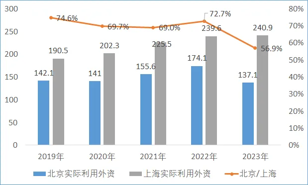 圖1 2019-2023年北京市和上海市利用外資比較(億美元)
