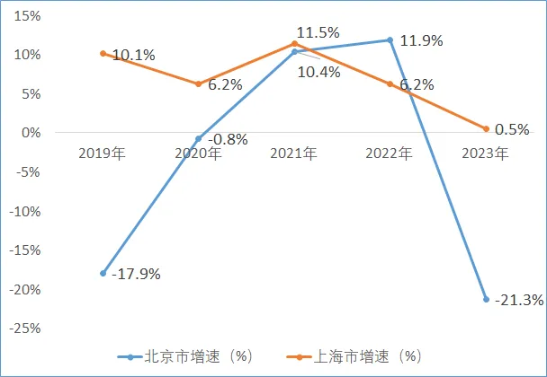 圖2 2019-2023年北京市和上海市利用外資增速比較(%)