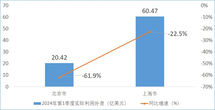 當前,地緣政治沖突加劇,大國經濟增長承壓,各類風險因素疊加,導致全球資金包括直接投資的流動放緩,2024年1季度,全國實際利用外資金額3016.7億元人民幣,同比下降26.1%,與2023年第四季度比,環比增長41.7%。在國家整體大背景下,今年1季度,北京市新設外資企業417家,比上年增長19.1%,實際利用外商直接投資20.42億美元,同比下降61.9%;上海市新設外商投資企業1340家,比去年同期增長16%,實際利用外資金額為60.47億美元,比去年同期下降22.5%。