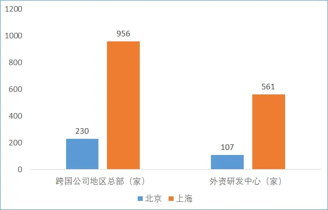 隨著我國開放步伐逐漸加快,跨國公司地區總部和外資研發中心已成為跨國公司中國本土化戰略的重要組成部分,是推動創新要素跨境流動和全球配置的重要載體。截至目前,北京市已累計認定跨國公司地區總部230家、外資研發總部22家,伴隨北京市第四批外資研發中心認定結果出爐,北京市外資研發中心總數已達到107家。相比之下,2023年上海市累計認定跨國公司地區總部956家,外資研發中心561家,年內新增跨國公司地區總部65家,外資研發中心30家。