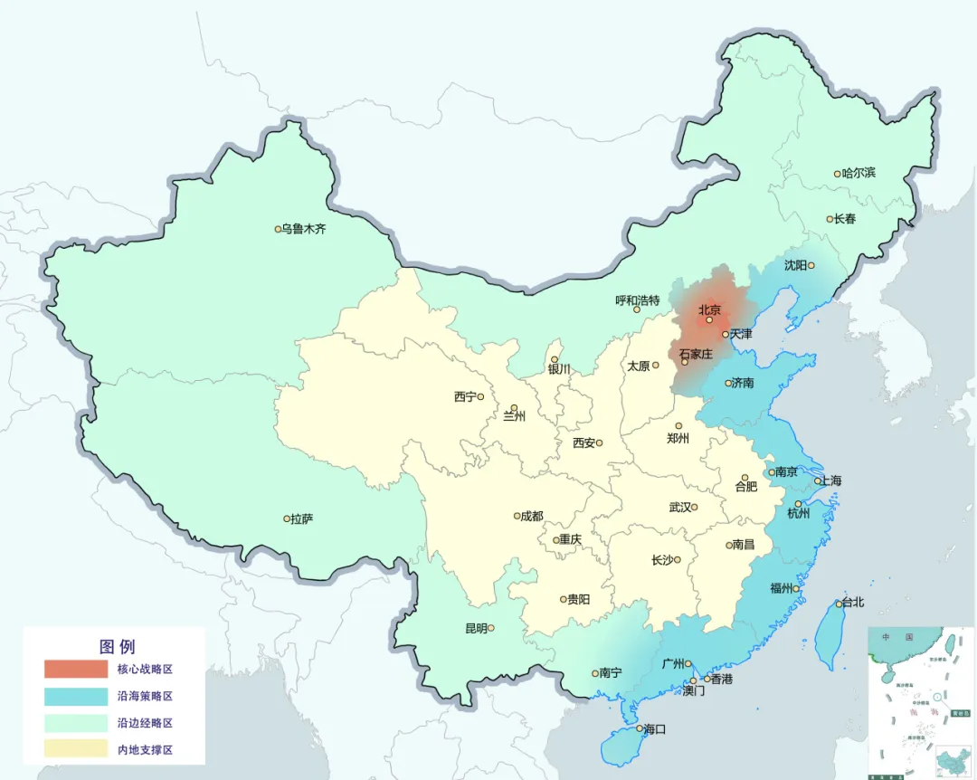 核心戰略區:北京、天津、河北(雄安);沿海策略區:遼寧、山東、江蘇、上海、浙江、福建、廣東、廣西、海南、香港、澳門、臺灣;沿邊經略區:廣西、云南、西藏、新疆、內蒙古、黑龍江、吉林、遼寧;內地支撐區:貴州、重慶、四川、青海、甘肅、寧夏、陜西、山西、河南、湖北、安徽、江西、湖南。