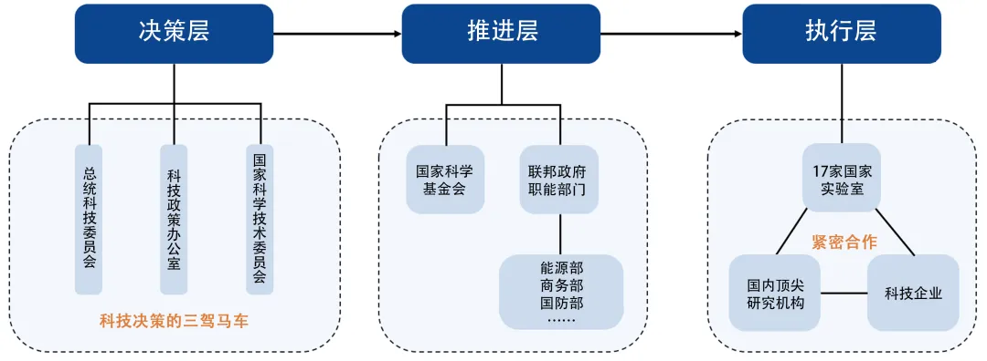 美國政府及人工智能發展推進機構分為決策層、推進層和執行層。決策層承擔提出政策建議、決定政策方向的任務,包括總統科技顧問委員會(PCAST)、科技政策辦公室(OSTP)和國家科學技術委員會(NSTC),這三個機構被稱為聯邦政府科技決策的“三駕馬車”。推進層負責落實政策、推進項目,以能源部、商務部等職能部門以及美國國家科學基金會(NSF)為核心。執行層主要由能源部管轄的17家國家實驗室構成,將研究資源輸送到人工智能各細分領域,與頂尖高校等研究機構和前沿科技企業合作共同開展前沿科研工作。
