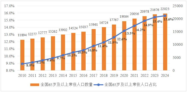 圖1 2010—2024年全國65歲及以上老年人口規模及占比情況統計