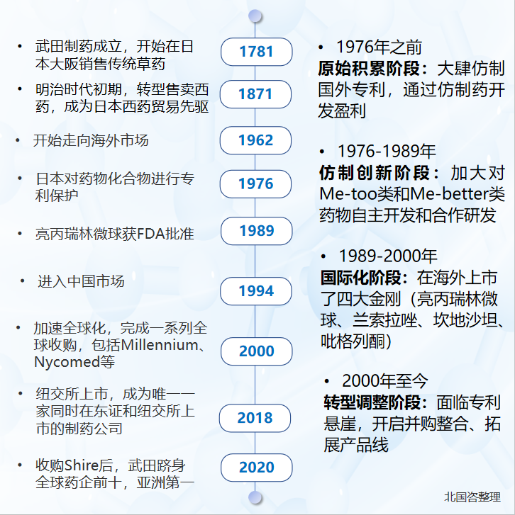 卷首語: 醫藥健康是全球新一輪科技產業變革中最為密集、投資最為活躍的領域,具備“高風險、高投入、高回報、長周期”的典型特征,10年研發周期、10億美元投入、低于10%的成功率成為原創重磅級產品創新的行業共識。 21世紀之前,中國以化學藥為主的醫藥制造業基礎薄弱,基本依靠仿制藥發展,90年代數家國內藥企依托首仿藥成長成為本土龍頭企業。2000年以來,在國家戰略布局、重大新藥創制專項等促進下,在政策、資本、人才等多因素共同驅動下,我國生物醫藥自主創新進程加快,創新層次從派生藥(Me-too)、改進藥(Me-better)向原研首創藥(Me-first)攀升,尤其是近年來,審評審批改革、上市許可持有人制度(MAH)等拉動創新型藥品醫療器械臨床和上市提速,仿制藥一致性評價和醫保改革倒逼加大創新投入,CXO賦能進一步加速創新研發進程,醫藥領域創新不斷蓄力、加快轉化為發展新動能。 本研究通過對國內外典型藥企創新產品研發模式進行案例分析,歸納梳理了“以仿養創”的轉型升級之路、巨頭企業的融合發展之路、從Biotech到Biopharma的自我成長之路、License in/out的借力起飛之路共四類模式(分四期連載),以期在全球醫藥健康科技和產業激烈的競爭浪潮中,為尋找中國創新藥企業加速騰飛的錨點提供參考借鑒。本期請關注:“以仿養創”的轉型升級之路。 第一期 “以仿養創”的轉型升級之路 “以仿養創”是指仿制藥企業通過仿制藥打開市場,依托仿制藥端持續、穩定的現金流,為高投入、長周期的創新藥研發不斷造血,經歷了仿制藥研發、仿創結合、自主創新的發展路徑,最終實現創新藥成功上市,幫助企業完成轉型。卷首語: 一、恒瑞醫藥 (一)基本信息 恒瑞醫藥成立于1970年,是當前中國醫藥行業最具有綜合實力的龍頭企業,其通過“以仿養創”模式,已成為國產創新藥Big Pharma,國際影響力突出。在PharmExec(美國制藥經理人雜志)公布的2022年全球制藥企業TOP50榜單中,恒瑞位居第32名,是中國唯一進入前35名的企業?,F市值達3000億元,穩坐A股上市藥企第一寶座。恒瑞產品聚焦于三個主營板塊(抗腫瘤藥物,麻醉鎮痛和造影劑),在國內業務市場均占有領先位置。根據PDB數據庫,抗腫瘤藥物方面,2021年恒瑞在國內醫院的市占率達到5.72%,位列第二,第一為羅氏(10.74%)。 作為“以仿養創”的國內典型企業,恒瑞在1990s布局首仿藥,率先仿制國外專利藥。如恒瑞是國內第一家仿制多西他賽(賽諾菲-安萬特)的企業,并于2002年9月30日獲得上市批文。此后十年磨一劍,于2011年上市了其第一款創新藥艾瑞昔布,打破了鎮痛領域長期被國際醫藥巨頭壟斷的尷尬現實。 近年來,恒瑞的創新藥進入收獲期。截至2023年7月,恒瑞醫藥共上市13款創新藥,其中11款近五年獲批。且創新藥業務占比逐年上升,2022年創新藥貢獻了恒瑞營收的38.15%,恒瑞距離完成從仿制藥企業向創新藥企業(創新藥收入占比超過50%)的蛻變指日可待。 (二)發展歷程 (三)特點總結 意識先行,先行業而動。恒瑞1990年從基礎原料藥向仿制藥轉型,之后開始布局創新藥,從“仿制藥生產”到“仿創結合”,再到現在的“創新驅動”,恒瑞每一次改革都趕在行業變遷的前面,牢牢把握住醫藥行業的發展規律。 一以貫之,重視創新研發。恒瑞在2022年業績下滑,但其研發強度依舊提升至29.83%,已反超全球研發投入最多的10大藥企(平均研發強度19%),并遠高于我國A股生物醫藥公司(平均研發強度4.6%)。高強度的研發投入也讓恒瑞以13款創新藥位列國內藥企第一。 “大國”視野,推進國際化進程。恒瑞積極拓展海外市場,早在2009年,恒瑞的磷酸瑞格列汀臨床研究就進行了中美雙報,并獲得了批準。近些年,恒瑞陸續將卡瑞利珠單抗、吡咯替尼、SHR-1701等授權出讓給國際知名藥企,推動恒瑞醫藥走向國際。去年5月,恒瑞醫藥成立了全資子公司Luzsana Biotechnology,負責恒瑞醫藥管線產品的國際化。 行而不輟,靜待花開。創新藥的研發投入高、周期長、風險高,巨大的研發成本使得許多藥企望而卻步,但是恒瑞沒有放棄,在經歷許多研發失敗的情況下,亦堅持不懈,耐得住寂寞,直到研發創新藥成功為止。目前恒瑞有240多項臨床試驗在國內外開展,建立了梯隊化的產品管線,積累了豐富的創新藥研發儲備。 二、武田制藥 (一)基本信息 武田制藥于1781年(相當于乾隆后期)在日本素有“醫藥城”之稱的大阪府成立,是當前亞洲最大的制藥企業,位居全球藥企前10強。近年來,武田制藥在其五個主要業務領域:腫瘤、罕見病、神經科學、消化和血液制品等各領域都研制出引人矚目的高效藥物。其消化領域的明星產品Entyvio(維得利珠單抗)是目前炎癥性腸病(IBD)領域唯一的腸道選擇性生物制劑,具有市場獨占權。腫瘤領域的莫博賽替尼(mobocertinib)是全球首款也是目前唯一獲批的治療EGFR 20號外顯子插入突變晚期非小細胞肺癌的口服靶向藥物,疾病控制率(DCR)高達78%。 作為“以仿養創”的國際化典范,武田制藥的發展歷程經歷了“普藥→仿制藥→仿創藥→創新藥”四個階段。其最開始只進行普藥銷售,在日本對藥物化合物進行專利保護,且嚴格區分新藥和仿制藥的價格差距后,武田加大對Me-too類和Me-better類藥物的自主開發和合作研發。1980-2000年,其研發上市了仿創藥四大重磅產品(亮丙瑞林微球、蘭索拉唑、坎地沙坦、吡格列酮),為其創收了大量的原始資本。之后,武田重磅藥物專