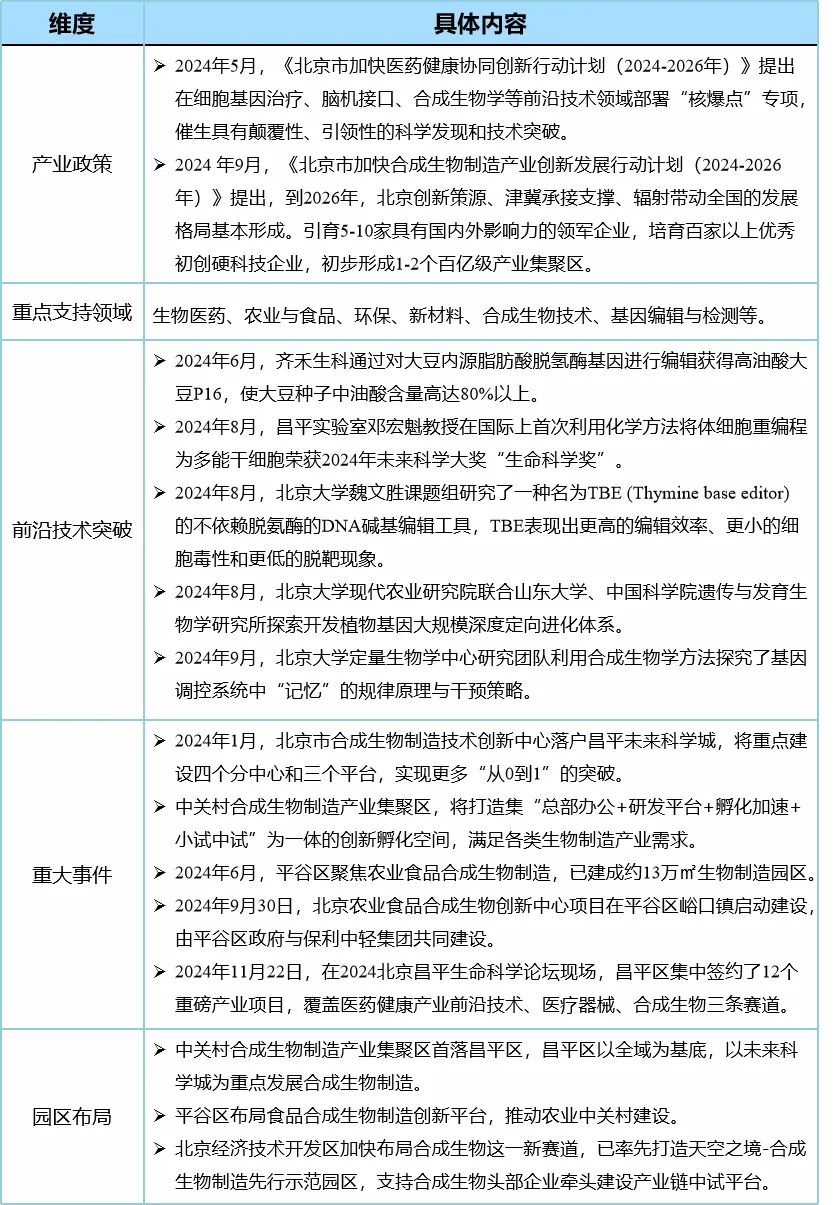 加強頂層謀劃,統籌部署關鍵任務。2024年5月,北京市明確提出要在合成生物學、細胞基因治療等前沿技術領域部署“核爆點”專項。同年9月,發布了北京市首個合成生物制造產業的專項行動計劃,并配套出臺落實具體支持形式的若干措施,提出到2026年要基本形成北京創新策源、津冀承接支撐、輻射帶動全國的發展格局,打造1-2個百億級產業集聚區。