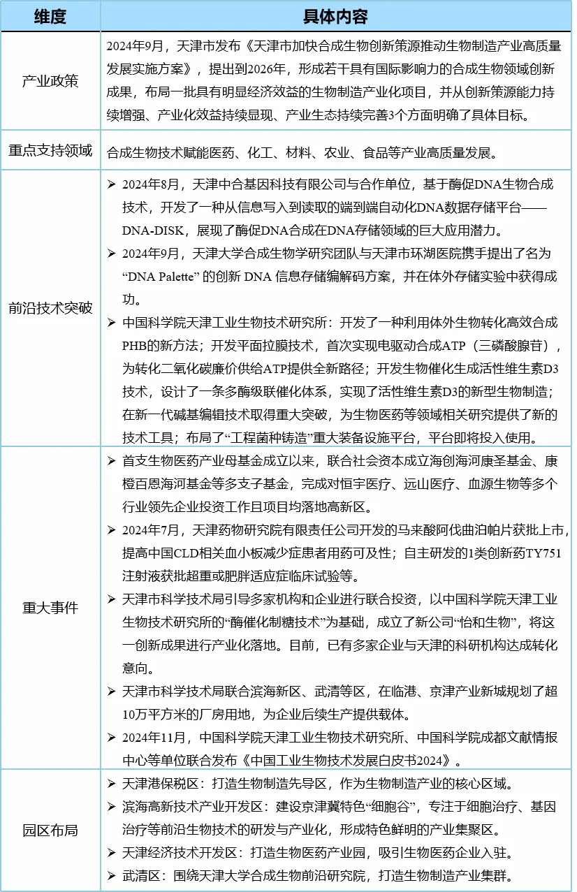 聚焦重點領域,向高端化智能化邁進。2024年9月,《天津市加快合成生物創新策源推動生物制造產業高質量發展實施方案》發布,提出到2026年,布局一批具有明顯經濟效益的生物制造產業化項目,從創新策源能力持續增強、產業化效益持續顯現、產業生態持續完善三方面明確了具體目標。方案提出重點布局工業菌種創制、DNA和基因組合成、二氧化碳生物轉化等關鍵核心技術及生物制造智能設備國產替代領域。注重合成生物技術賦能醫藥、化工、材料、農業、食品等領域。