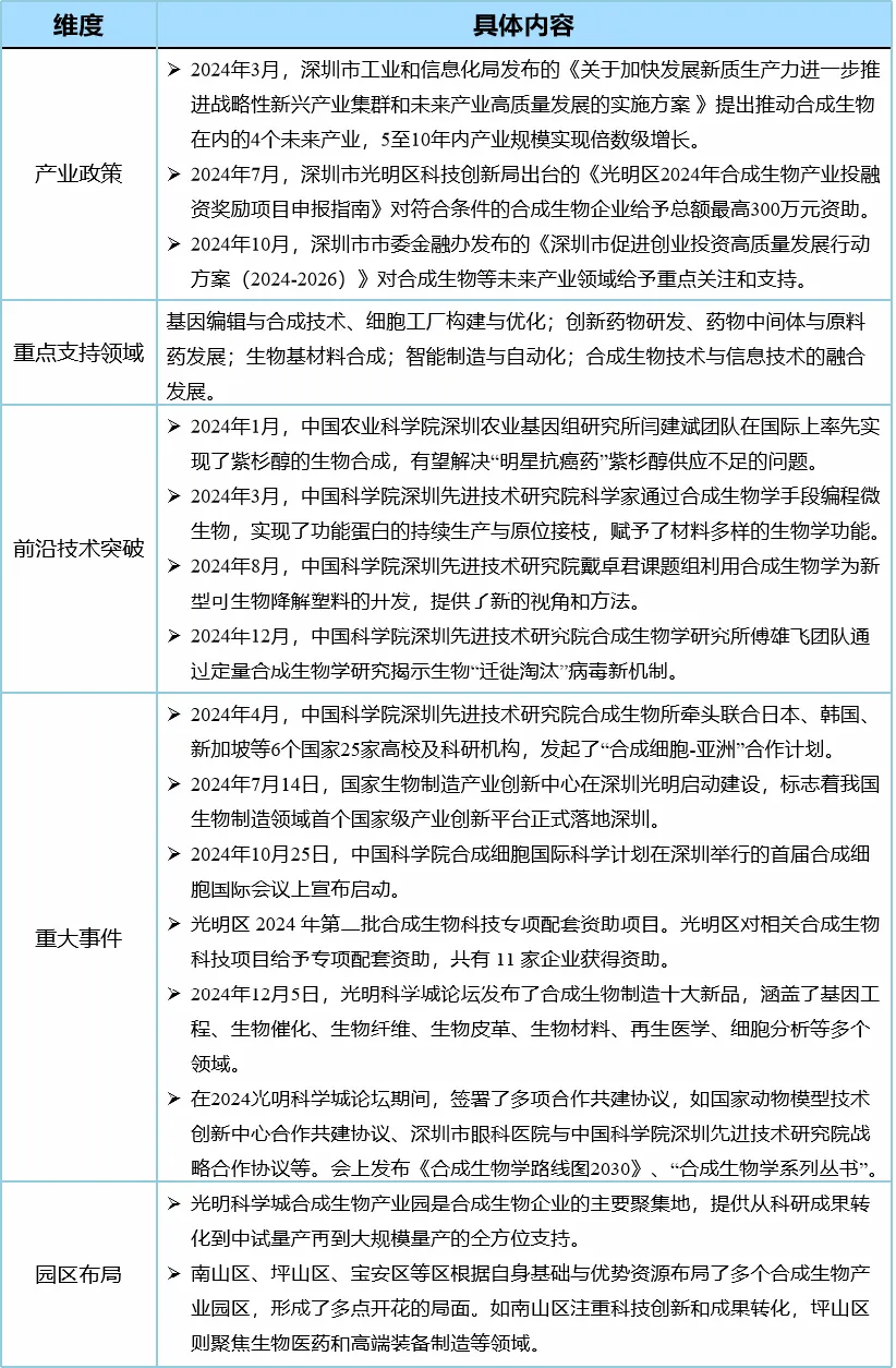 各部門聯合發力助力合成生物產業發展。2024年3月,深圳市工業和信息化局發布《關于加快發展新質生產力進一步推進戰略性新興產業集群和未來產業高質量發展的實施方案》,提出推動合成生物在內的4個未來產業,5至10年內產業規模實現倍數級增長。光明區科技創新局設置合成生物產業投融資獎勵項目,對企業進行總額最高300萬元的資助。市委金融辦發布行動方案對合成生物等未來產業領域給予重點關注和支持。
