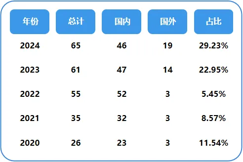 2024年共65款創新醫療器械產品上市(詳表附后),同比增長6.6%,獲批數量為2014年以來的歷史新高。從數量上看,美國直覺外科公司獲批產品數量最多,系歷年首次有國外企業獲此“殊榮”,其共獲批5款產品,均為支氣管導航操作系統部件。其次為北京品馳醫療,共有4款產品獲批,包括植入式腦深部電刺激電極導線套件等創新產品。