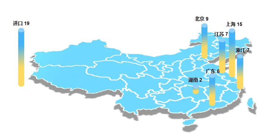 65款獲批產品中,本土46款(占71%)、進口19款(占29%),進口產品的比例首次升近三成,可見隨著我國創新醫療器械審批制度不斷與國際接軌,創新醫療器械市場日益融入全球。本土品種上,上海共獲批15款創新醫療器械,位居全國第一,領先北京9款,兩地獲批產品數量合計占比從2023年的33%攀升至2024年37%。進口品種上,美國國際引領地位更加突出,獲批數量(17個)占比近9成,遠高于2023年的6成;另有德國、日本各1個獲批在國內上市。