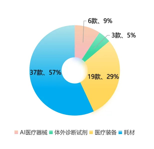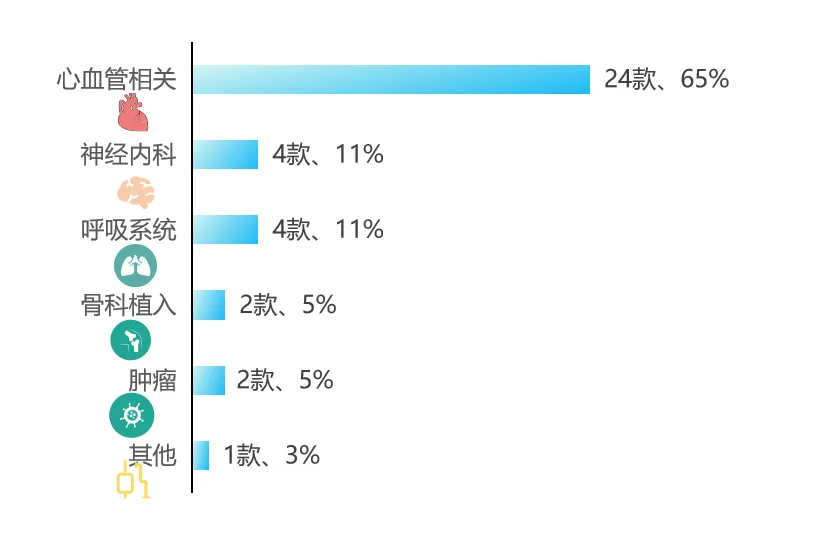 高值耗材創新產品共獲批37款,其中心血管植介入器械呈現“井噴”現象從去年的9款增加到了今年的24款,產品類型以支架和導管為主。