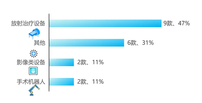 高端醫療裝備創新產品獲批共19款,放射性治療設備較去年增加,其中微創消融類裝備實現翻倍增加(從3增加到6),幫助腫瘤治療手術有效減輕患者痛苦并提升疾病治愈率。