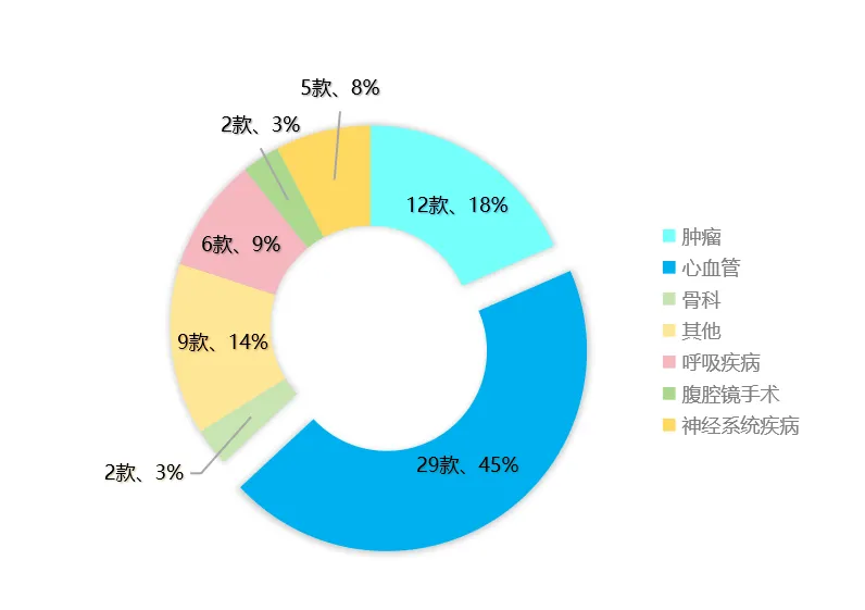 心血管位列第一,共29款產品,占比45%,腫瘤緊隨其后,12款產品,占比18%。這一數據與《中國心血管病報告2023》中提到的“中國心血管病死亡率居疾病死亡構成的首位,高于腫瘤及其他疾病”成鮮明的對應關系,反映出心血管疾病和腫瘤疾病在我國疾病防治中的重要性和緊迫性。