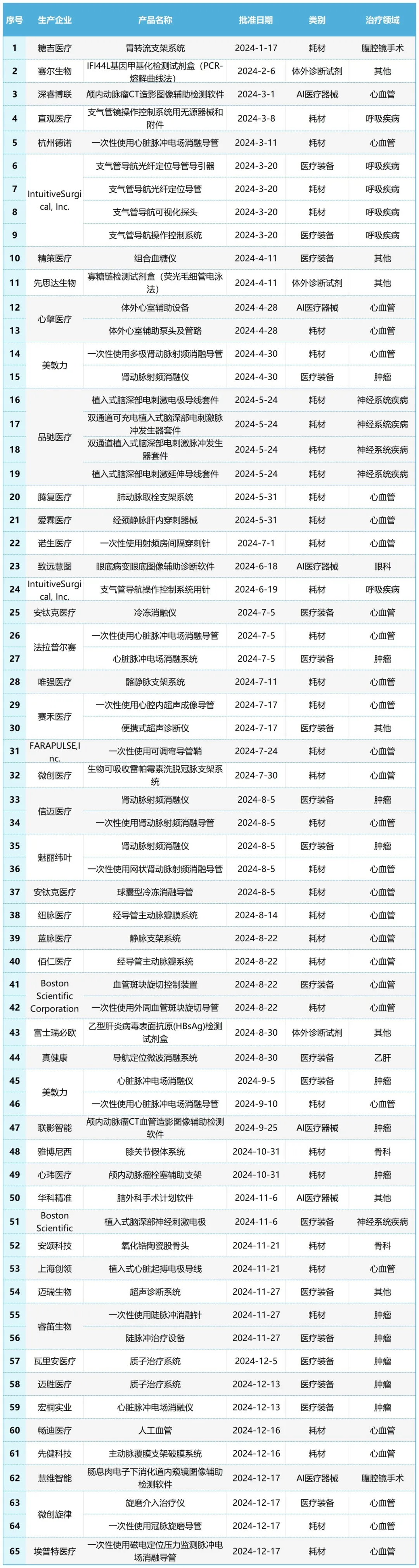 2024年,我國共有65款創新醫療器械獲得國家藥品監督管理局(NMPA)批準上市,獲批數量創歷史新高,總體來看國際化發展態勢不斷增強,區域集聚效能愈發顯著,多款運用國際首創技術的國內首款產品接續發布,展現出強大的創新能力和高質量發展趨勢。獲批產品具體特點如下: