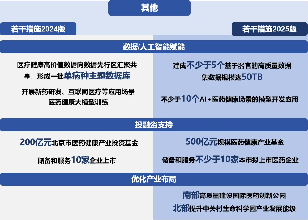 4月7日,北京市醫(yī)保局、市衛(wèi)生健康委等九部門(mén)聯(lián)合發(fā)布《北京市支持創(chuàng)新醫(yī)藥高質(zhì)量發(fā)展若干措施(2025年)》(簡(jiǎn)稱(chēng)《若干措施2025版》),從創(chuàng)新研發(fā)、臨床試驗(yàn)、審評(píng)審批、生產(chǎn)制造、流通貿(mào)易、臨床應(yīng)用等全鏈條提出新一輪32條措施,持續(xù)完善“一條鏈”服務(wù),進(jìn)一步推動(dòng)北京市“萬(wàn)億”醫(yī)藥健康產(chǎn)業(yè)再上新臺(tái)階。這是北京市醫(yī)保局、市衛(wèi)生健康委等九部門(mén)連續(xù)第二年共同出臺(tái)支持創(chuàng)新醫(yī)藥高質(zhì)量發(fā)展的專(zhuān)項(xiàng)政策,2024年4月17日發(fā)布的《北京市支持創(chuàng)新醫(yī)藥高質(zhì)量發(fā)展若干措施(2024年)》(簡(jiǎn)稱(chēng)《若干措施》)實(shí)施成效顯著。本文對(duì)兩版政策進(jìn)行對(duì)比,結(jié)合北京支持創(chuàng)新醫(yī)藥發(fā)展的實(shí)際成效,梳理《若干措施2025版》的政策亮點(diǎn)。