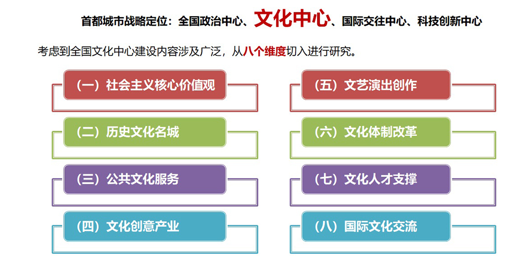 落實北京市“四個中心”城市戰(zhàn)略定位,從全國文化中心的內涵和要求出發(fā),聚焦“古都文化、紅色文化、京味文化和創(chuàng)新文化”,明晰全國文化中心建設思路,提出發(fā)展目標,部署重點任務